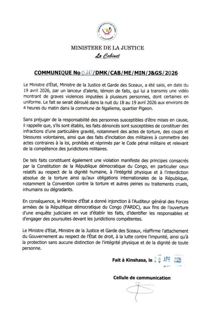 Ce lundi 20 avril 2026, le Ministère de la Justice et Garde des Sceaux a exprimé sa détermination suite à la publication d’une vidéo mettant en scène des violences sévères dans la municipalité de Ngaliema. Une enquête de justice a été promptement mise en place.